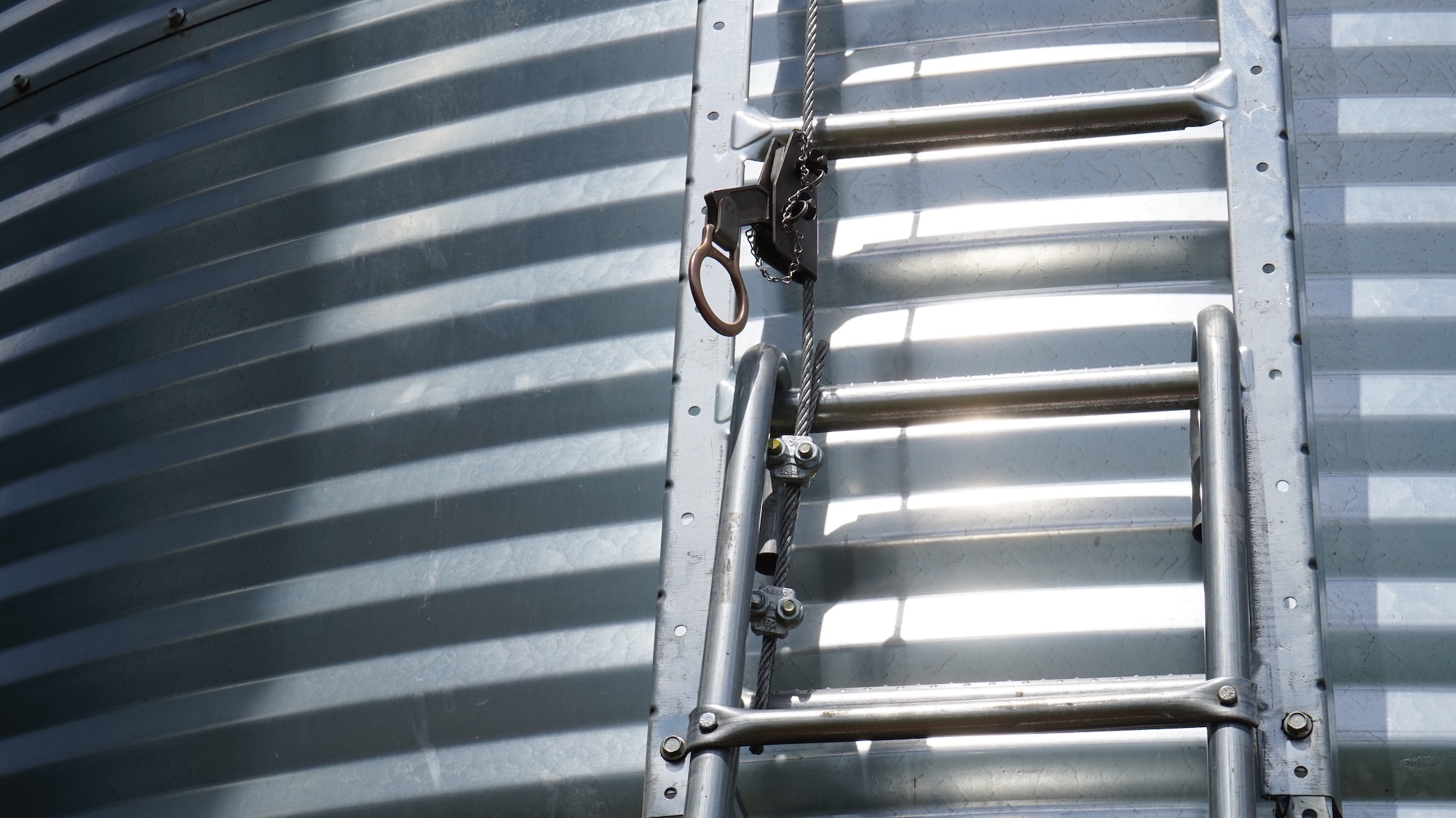 Bin Safe is an engineered fall protection system designed to work with Blind Bolt, Standing Seam, Smooth Wall or Corrugated Wall grain bins. The system works by attaching a wire rope that is anchored to the top of the bin with the other end attached to the bottom of the ladder. Bin Safe is easy to use and makes climbing bins safe without slowing you down.